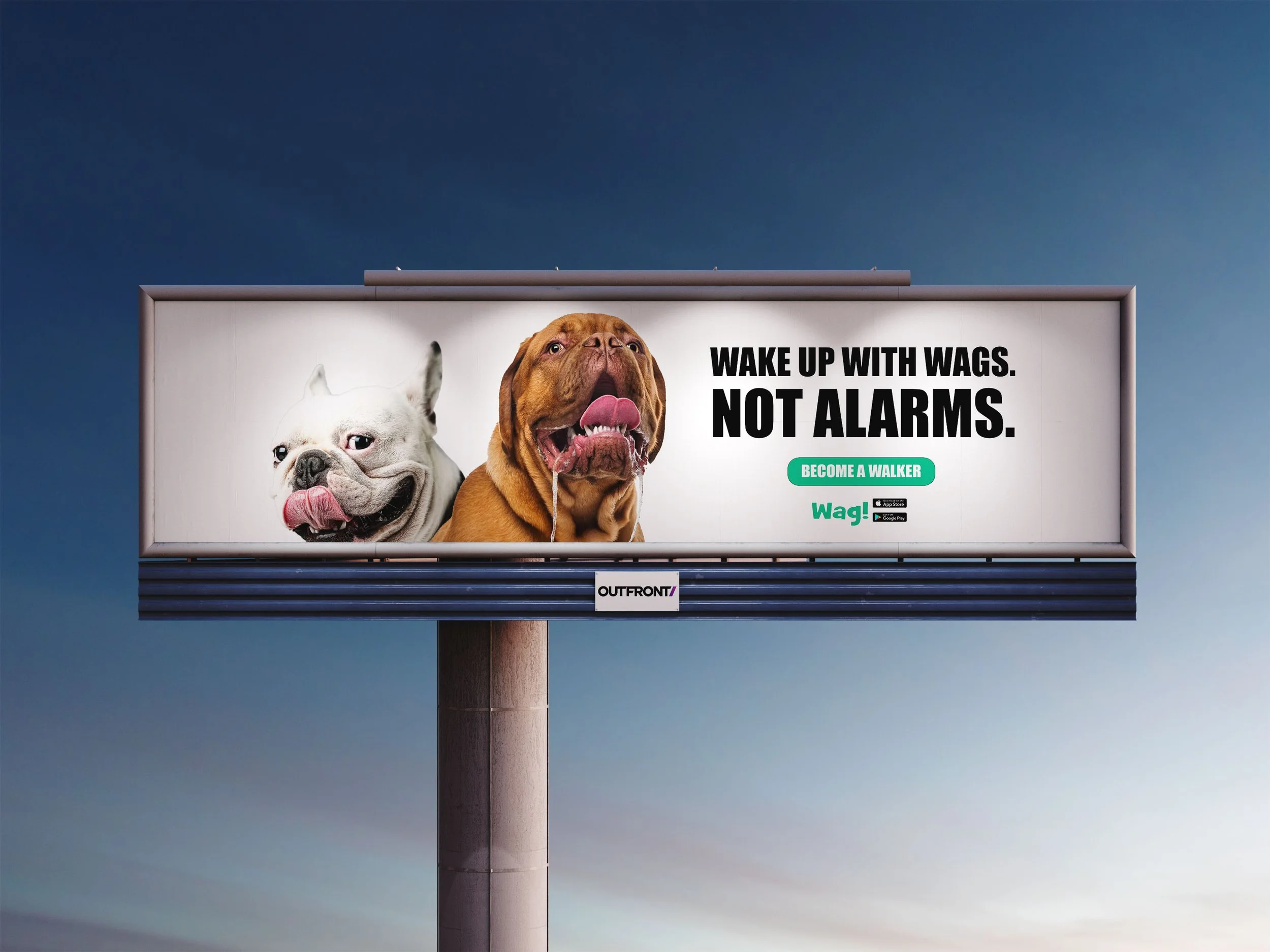 When Wag! wanted to attract more gig economy workers, I developed a campaign that reframed dog walking as the side hustle that loves you back. The concept, “What’s Your Side Hustle?”, taps into the rise of freelance work, while celebrating the unique rewards of spending time with dogs.